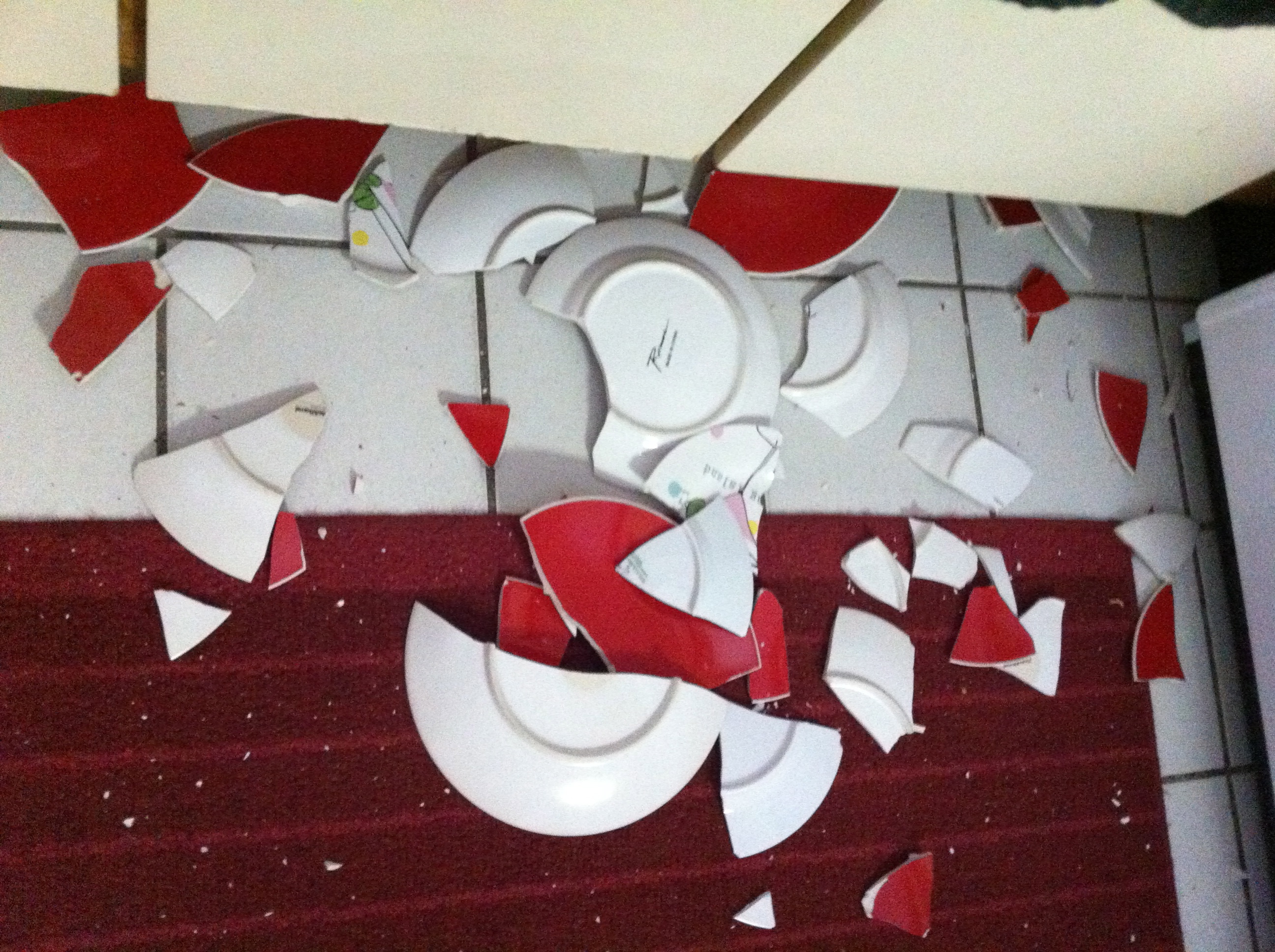 Now I’m guessing, that due to possibly microscopically minute vibrations radiating up to the cabinet through the wall, one of the shelving supports failed. Out tumbled a good portion of the dishes from the cabinet, onto the range and the floor. Unfortunately, there were few survivors.