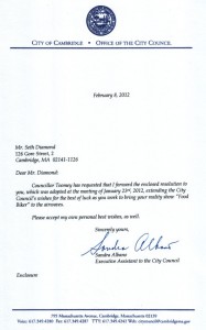 On Friday evening, coming home after a long and exciting week, there was an oversize envelope awaiting me in the mailbox. I wasn’t expecting anything in the mail, and the return address was from the Cambridge City Council at City Hall. I didn’t think I had any outstanding parking tickets or City of Cambridge excise taxes due (at least yet), and I’ll admit that I was a bit puzzled what it might be.