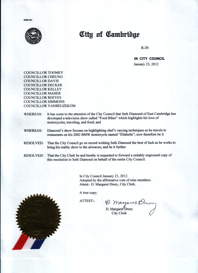 Well, apparently, someone on the City Council must have read the Boston Herald article on Food Biker, as they decided to pass Resolution #55 of 2012, wishing me the best of luck on pursuing Food Biker. In the folder was a beautiful letter, complete with a seal and ribbon, with the details of Resolution 55 (Resolution #29 of the January 23rd session).